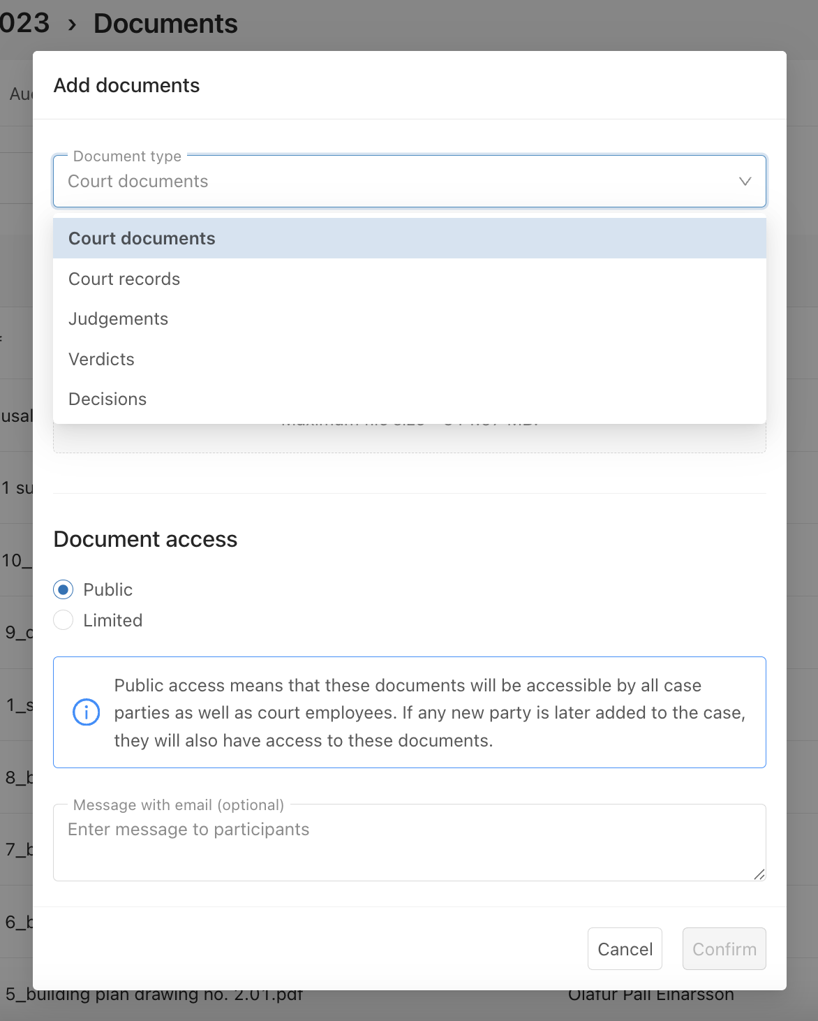 - Select the appropriate document type. The default type is “Court Document”. Depending on your user role, additional types (such as “Judgment”, “Court Record”, etc.) may be available.