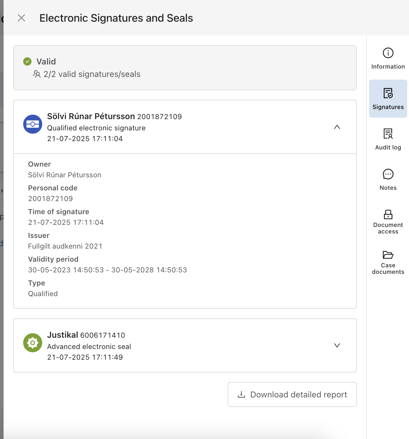 - Justikal has a built-in validation service that verifies electronic signatures and seals, regardless of the solution used to generate them. This service is eIDAS-certified, ensuring compliance with European standards. Signature and seal information is displayed by clicking the upper right corner of each document's page. The validation service clearly shows whether the signature or seal uses a simple, advanced, or qualified trust service. The legal effect of these trust services is defined in Act No. 55/2019.